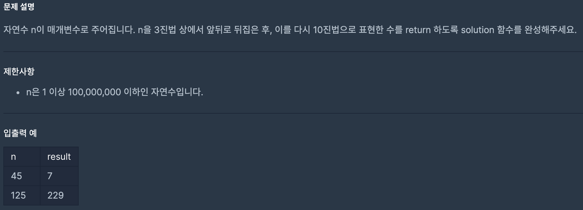 [ํ๋ก๊ทธ๋๋จธ์ค] 3์ง๋ฒ ๋ค์ง๊ธฐ ๋ณธ๋ฌธ