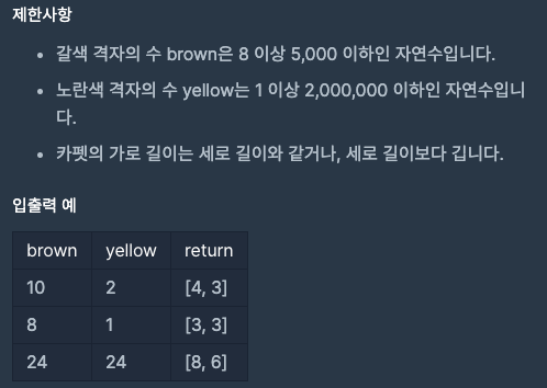 ์ผ๋จ ์นดํซ ํฌ๊ธฐ๋ฅผ ์ ํ๋ ๊ท์น ํน์, ์๋ฆฌ๋ฅผ ์์๋ด์ผ ํ๋ค. ์ฒ์ ์๋๋ brown ๊ธฐ์ค์ผ๋ก ํฌ๊ธฐ๋ฅผ ์ถ์ ํ๋ ค๊ณ ํด๋ณผ๊น ํ๋๋ฐ.. ์์ 3๋ฒ ์ผ์ด์ค์์ ์? ์ด๊ฑด์๋๊ฒ ๊ตฌ๋ ํ๊ณ ์๊ฐ์ด ๋ค์๋ค ใ ใ ์ฆ.. ์ด๋ฌธ์ ๋ yellow ๋ก๋ถํฐ ํฌ๊ธฐ๋ฅผ ์์๋ด์ผํ๋ค๋ ์๋ฏธ๋ค. ์ง์ฌ๊ฐํ๊ณ yellow์ ํฌ๊ธฐ๊ฐ ์ต์ 1x1์ ๋๋(์ ์ถ๋ ฅ ์ ํ์ฌํญ), yellow์ ํฌ๊ธฐ๋ง ์๋ฉด yellow์ (์์๋๊ธธ์ด + ์ข์ฐ๊ธธ์ด) x 2 + 4(๋์ชฝ๋ชจ์๋ฆฌ) ๋ง ํด์ฃผ๋ฉด brown์ ๊ฐฏ์๋ฅผ ๊ตฌํ ์ ์๋ค. (brown์ yellow๋ฅผ ๊ฐ์ธ๋ ํ ๋๋ฆฌ๋๊น) ๊ด๊ฑด์ yellow์ ํฌ๊ธฐ๋ ์ด๋ป๊ฒ ๊ตฌํ์ง? yellow์ ํฌ๊ธฐ๋ ๊ฐ๋กx์ธ๋ก๋ก ๊ตฌํด์ง ๊ฑด๋ฐ, ๊ฐ๋ฅํ ์กฐํฉ์ ๊ฐ๋กx์ธ๋ก (์ฝ์์ ๊ณฑ) ์ค์ ์์์ ๋์ถํ brown ๊ฐฏ์๋ฅผ ๊ตฌํ๋ ๊ณต์์ ๋ฃ์์๋ ์ ๋ ฅ brown๊ณผ ๋ง์ ๋จ์ด์ง๋ yellow๋ฅผ ์ ํํ ํ์, ๊ฐ๋ก/์ธ๋ก์ ๊ฐ๊ฐ +2์ฉ ๋ํด์ฃผ๋ฉด ์ด ํฌ๊ธฐ๊ฐ ๋๋ค! ์ฌ๊ธฐ์ ๊ฐ๋ฅํ ์กฐํฉ์ ๊ฐ๋ก/์ธ๋ก๋ ์ด๋ป๊ฒ ๊ตฌํ์ง?ใ ใ ์ค์ผ์ด ์์ฌ๋ ์์ ์ผ๋ก ๐ ์ด๋ค ์(A)์ ์ฝ์๋ฅผ ๊ตฌํ ๋๋ A๊ฐ 1๋ถํฐ Root A์ ์ ์๊ฐ(B)๊น์ง ํ์ธํ๋ฉฐ ๋๋์ด ๋จ์ด์ง๋์ง ํ์ธํ๊ณ , ๋๋์ด ๋จ์ด์ง๋ค๋ฉด B๊ฐ๊ณผ ๋ชซ์ A์ ์ฝ์๊ฐ ๋๋ค. Root๊น์ง๋ง ํ์ธํ๋ฉด ๋๋ ๊ฑด ์ค์ค๋ก ๊ณต๋ถํด๋ณด์๊ธธ ๐๐