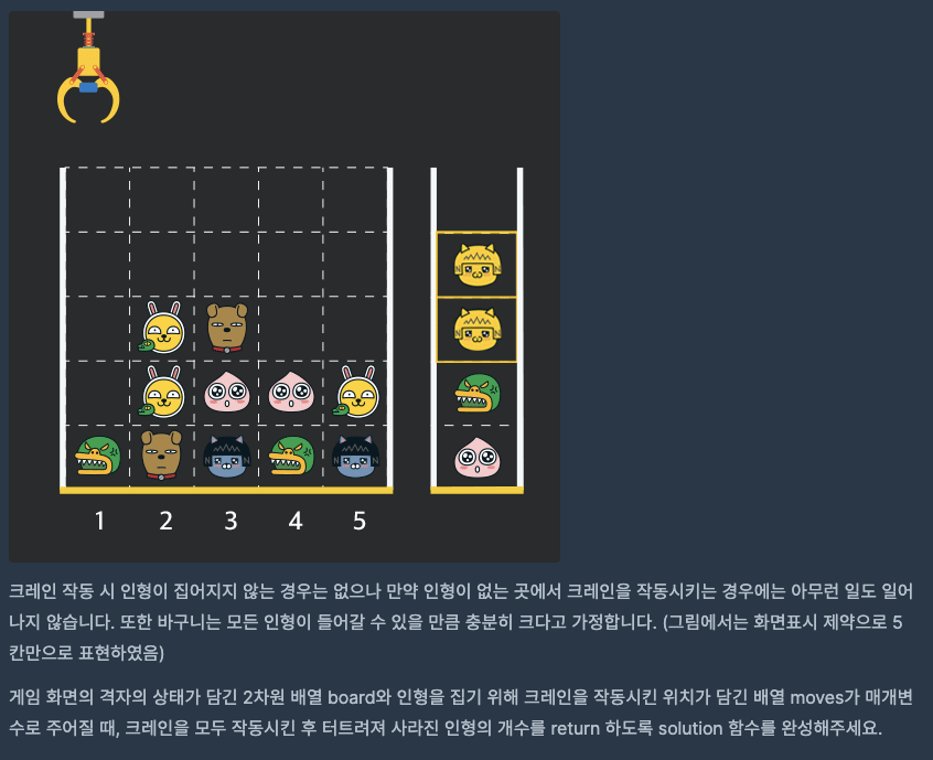 ใ ใ ๋ฌธ์ ๊ฐ ๋๊ธธ๋ค.๐ ๋ฌธ์ ์์ ์ํค๋๋๋ก ํฌ๋ ์ธ์ ์์น๋ฅผ ์ฐพ๊ณ , ํฌ๋ ์ธ์ ์ญ ๋ด๋ ธ์๋ ์ง์ ์ธํ์ด ์๋ค๋ฉด ๋ฐ๊ตฌ๋์ ์ฎ๊ฒจ์ ์ ์ผ ์์์๋ ์ธํ๊ณผ ๊ฐ์ ์ธํ์ด๋ฉด ๋๊ฐ๋ฅผ ํฐํธ๋ฆฌ๋ฉด ๋๋ค. ๊ทผ๋ฐ ๋ฌธ์ ๋.. ์ฃผ์ด์ง๋ board๋ฅผ ๊ทธ๋๋ก ์ฌ์ฉํ๊ฒ ๋๋ฉด ์ธํ์ ์ง์ด์ฌ๋๋, ํด๋น ๋ผ์ธ์ด ๋น์ด์๋์ง ์ฒดํฌํ๊ธฐ๊ฐ ์ข ์ ๋งคํด์ง๋ค. board[ํ][์ด]๋ก ๋ฐ๋ก ์ ๊ทผํ๊ธฐ๊ฐ ์ข.. ๐ญ ๊ทธ๋์ ๋๋ board๋ฅผ ์ข ๋ ์ฝ๊ฒ ๋ณด๊ธฐ์ํด ์กฐ๊ธ ํ์ ์์ผ์ ์๋ก์ด dolls๋ก ์ฌ์ฉํ๊ธฐ๋ก ํ๋ค. ์๋์ฒ๋ผ ๋๋ฆฌ๋ฉด, ํด๋น๋ผ์ธ์ด ๋น์๋์ง์ ์ ์ผ ์์์๋ ์ธํ์ ๊ฐ์ ธ์ค๊ธฐ ์์ํ๊ธฐ ๋๋ฌธ์ด๋ค!