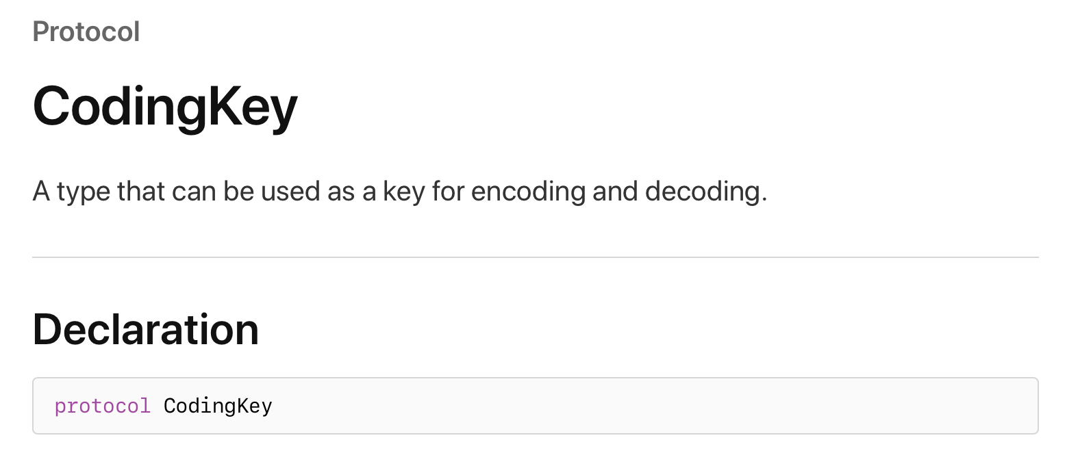 CodingKey ์ญ์ ํ๋กํ ์ฝ์ด๊ณ , ์ธ์ฝ๋ฉ ๋ฐ ๋์ฝ๋ฉ์ ์ํ ํค๋ก ์ฌ์ฉํ ์ ์๋ ํ์ ์ด๋ผ๊ณ ํ๋ค์ ๐