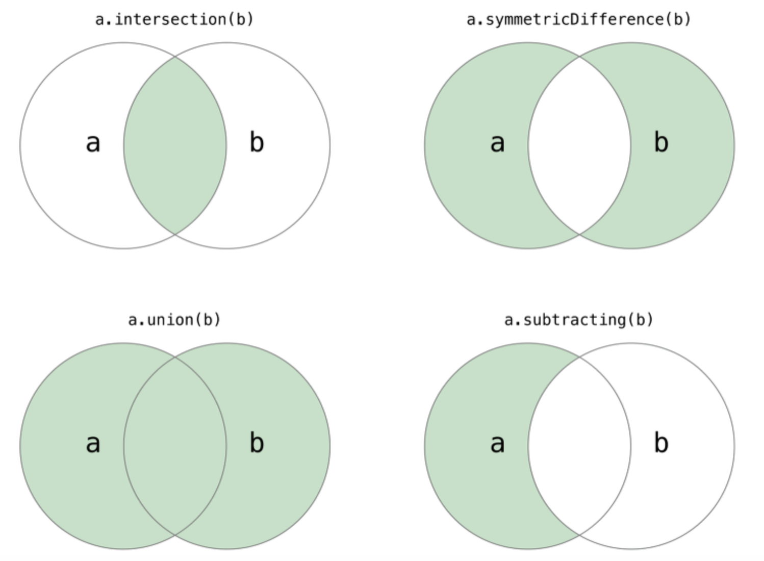 mySet.symmetricDifference(compareSet) // ν©μ§ν©-κ΅μ§ν© : ["iOS", "Developer", "name", "my"]