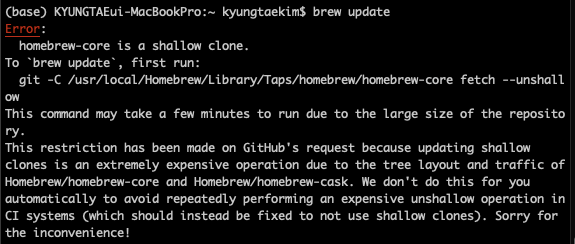 ๊ฒฐ๋ก : brew update์ค homebrew-core is a shallow clone ์๋ฌ๊ฐ ๋ฐ์ํ๋ค๋ฉด,
