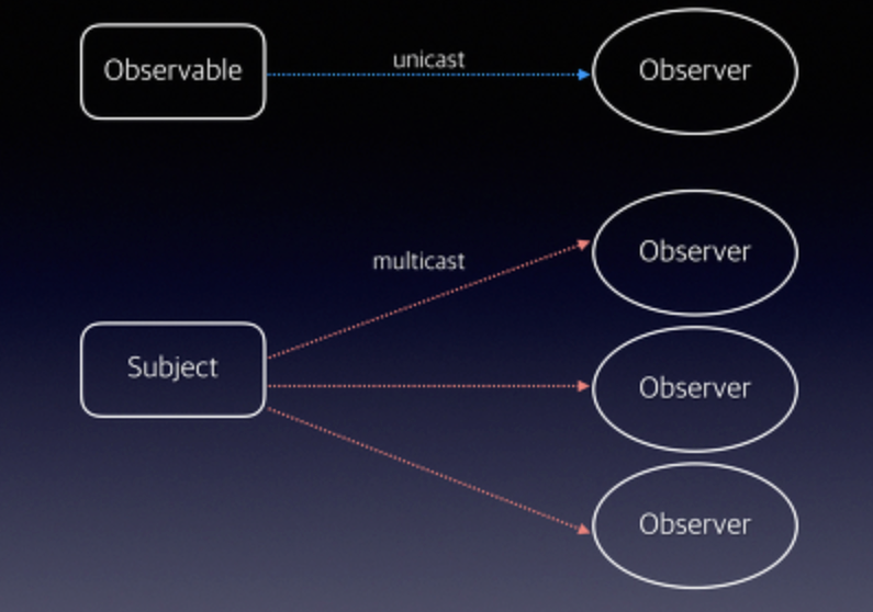Observable๊ณผ ์ฐจ์ด์ ์ ๊ตฌ๋ ์ค์ธ ํ๋์ Observer์๊ฒ๋ง ๊ฐ์ ๋ฐฐ์ถํ๋ค๋ ์ฐจ์ด์ ์ด ์์ด์. (unicast ๋ฐฉ์)